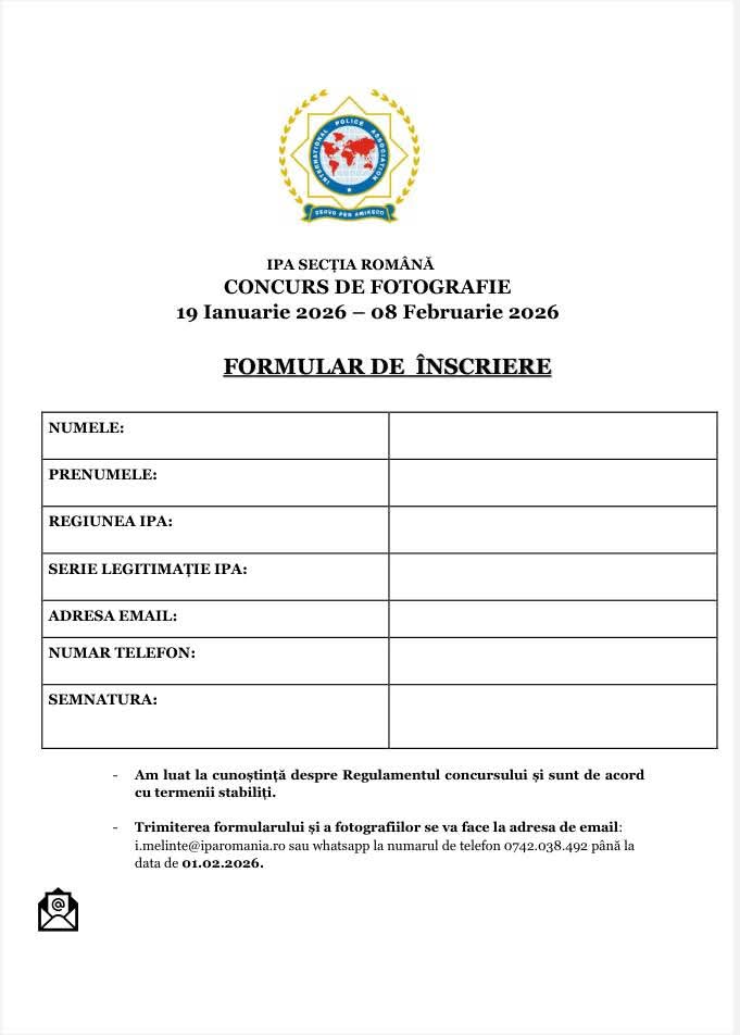 IPA – Secția Română lansează Concursul de Fotografie dedicat membrilor IPA, având ca tematică „PORTRET DE FEMEIE”. Invităm colegii pasionați de fotografie să surprindă, printr-o abordare creativă și respectuoasă, expresivitatea și unicitatea portretului feminin.